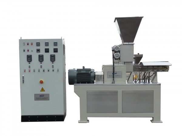 雙螺桿擠出機,是雙螺桿同向旋轉結構,螺桿上的螺紋塊和混煉塊相互精密齒合作用下,將原料充分熱熔,取得好的混料和分散效果。